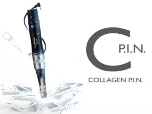 The Collagen P.I.N. electric powered micro needling pen is a handheld device used to create precise microscopic punctures in the skin of varying depths. The pen is composed of a series of fine needles which vibrate rapidly, penetrate the dermis, and allow for controlled induction of the skin self-repair mechanisms by creating ‘micro-injuries.’ These ‘micro-injuries’ are created by gently pressing and gliding the Collagen P.I.N. microneedles across the skin surface. These tiny needles vibrate rapidly, more than 7,000 RPM. The end point is the development of “pin-point bleeding.”